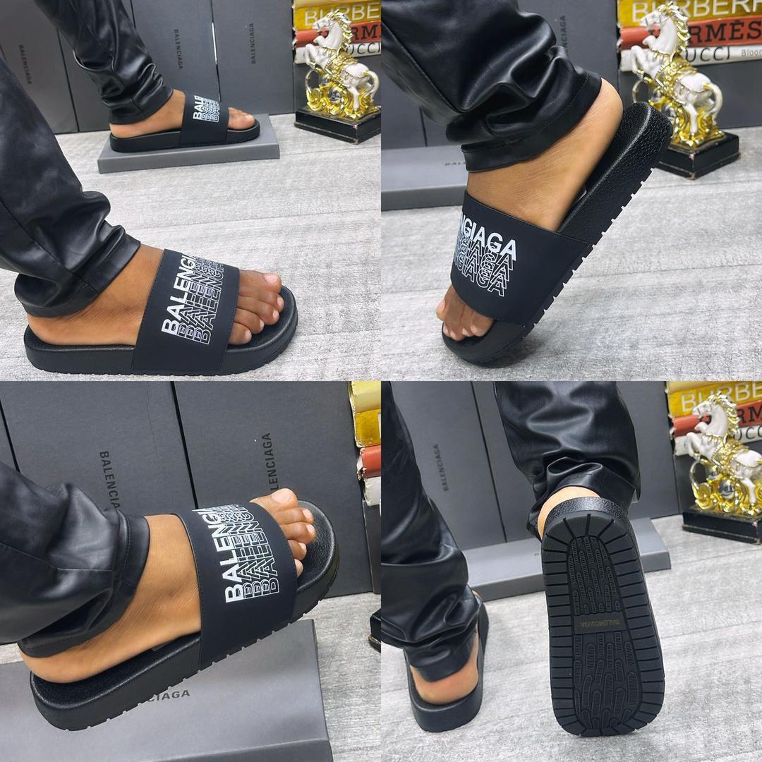 Make every step a statement with these Balenciaga slides. Showcasing a high-impact, stacked logo design on the strap, these sandals offer a bold graphic look that defines modern luxury streetwear. The wide strap and molded footbed provide a secure, comfortable fit, while the premium sole—stamped with the “Made in Italy” mark of quality—ensures you are walking on excellence. Whether styled with leather trousers or swim shorts, these slides elevate your entire outfit.