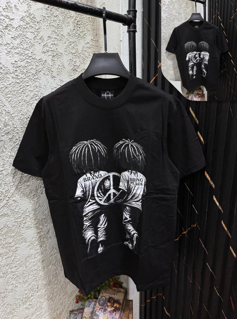 Make a powerful statement with this bold streetwear tee. Featuring a striking monochrome graphic of two figures united by a peace sign, this shirt isn’t just about style—it’s about a vibe. The high-contrast white print pops against the deep black fabric, creating a look that is both edgy and meaningful. Perfect for pairing with jeans or cargo shorts for a relaxed, urban outfit.