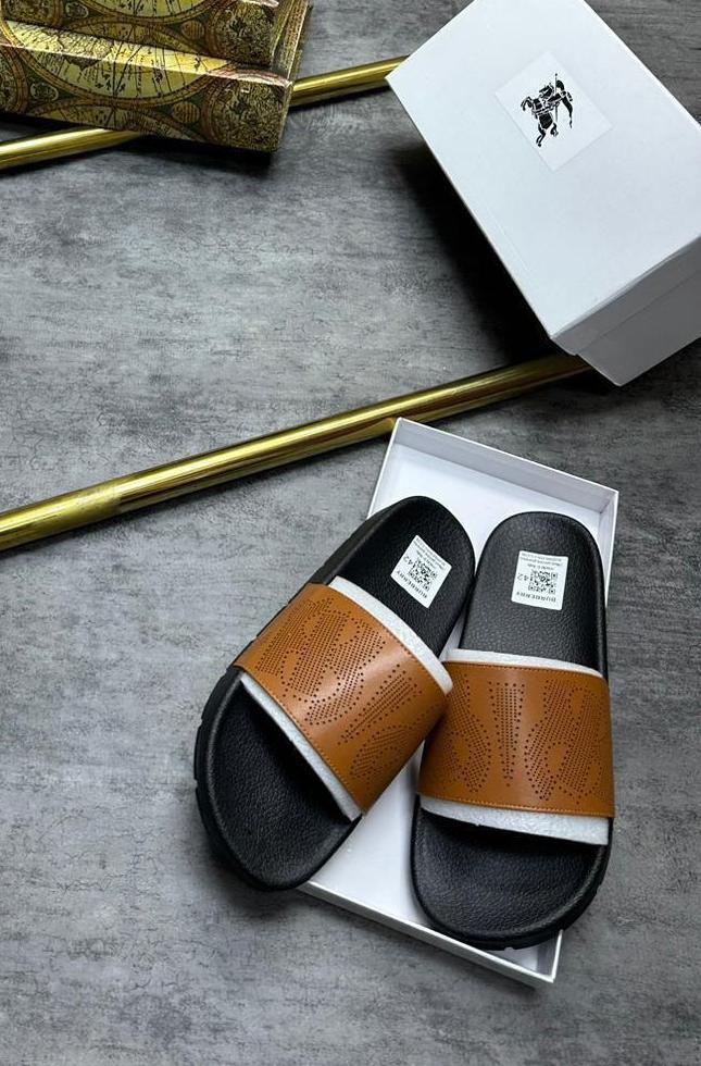 Add a touch of British heritage to your casual rotation with these sophisticated slides. Featuring a rich tan upper strap detailed with a perforated logo design, these sandals offer a refined, airy aesthetic perfect for warmer days. The contrast between the warm leather-tone strap and the sleek black sole creates a modern, versatile look that transitions effortlessly from the beach to the city streets.