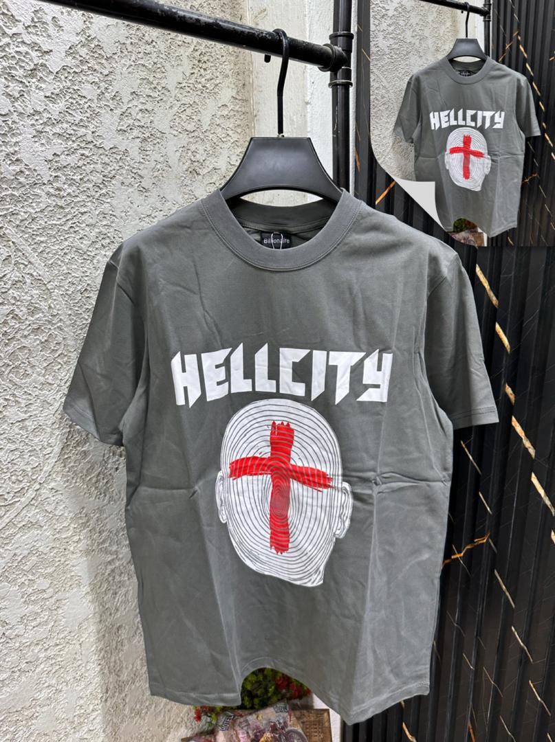 Add a moody, industrial edge to your fit with this grey colorway of the “Hellcity” graphic tee. Sitting perfectly between the stark black and crisp white versions, this grey edition offers a versatile, muted backdrop that allows the white “HELLCITY” lettering and the blood-red painted cross to pop with a gritty, underground intensity. It is the ultimate piece for a laid-back, modern grunge look.