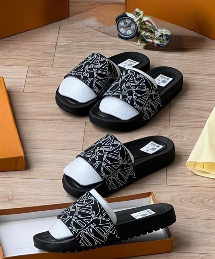 Make a bold impact with this artistic, high-energy take on the classic house codes. These Louis Vuitton slides feature a striking, graffiti-style white monogram print that pops against the sleek black strap. It’s a modern, streetwear-ready remix of a legendary design. Whether you are poolside or on the go, these slides offer the perfect combination of luxury status and edgy, contemporary style.