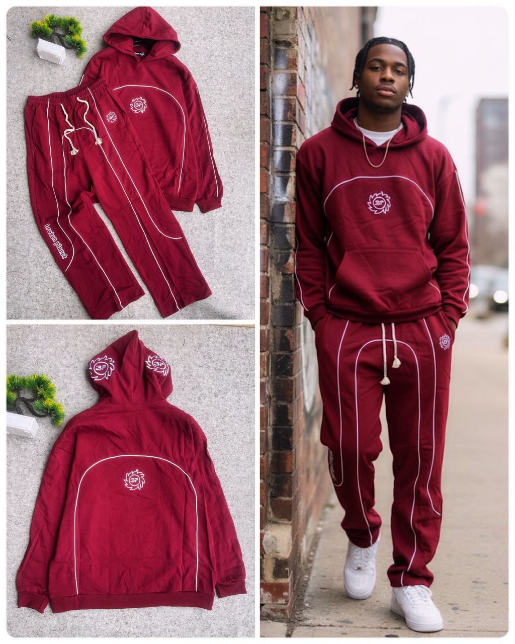 Stand out with this deep burgundy “Up & Down” hoodie set, featuring the trendy “Broken Planet” aesthetic. This streetwear staple combines rich color with distinct, high-contrast white piping details that trace the contours of the body for a unique, structured look. With its thick rope drawstrings and premium heavyweight feel, this set delivers both warmth and major style points.