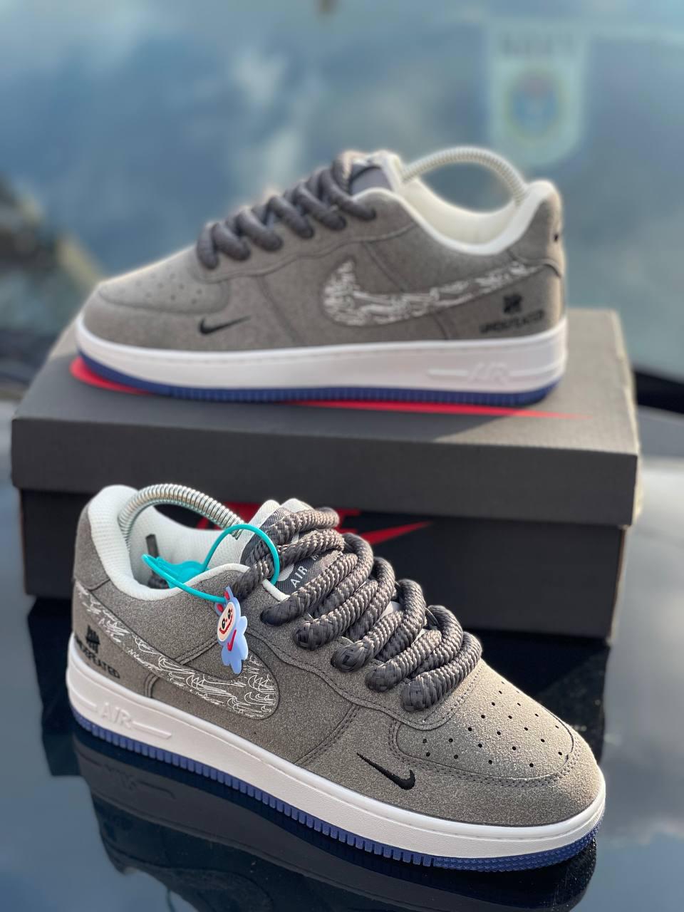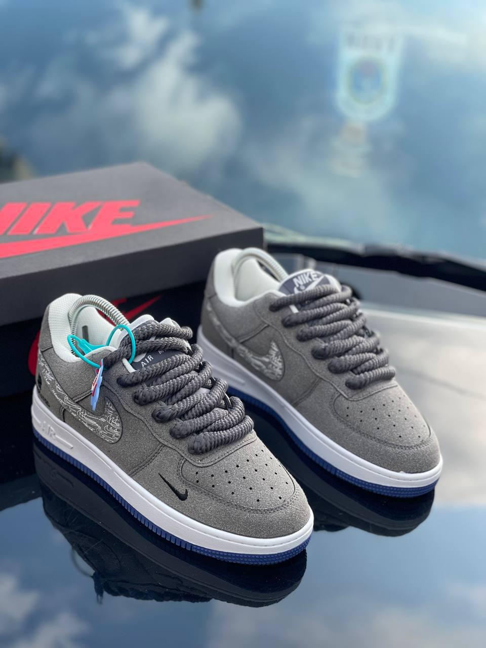 Level up your sneaker game with this exclusive take on the classic Air Force 1. Designed for those who crave a custom look straight out of the box, this pair features a premium grey suede upper highlighted by a unique paisley “bandana” print Swoosh. The standout feature is the thick, chunky rope laces that give the shoe a rugged, high-fashion edge. Finished with a cool blue outsole, these kicks offer a perfect mix of texture and color that demands attention.