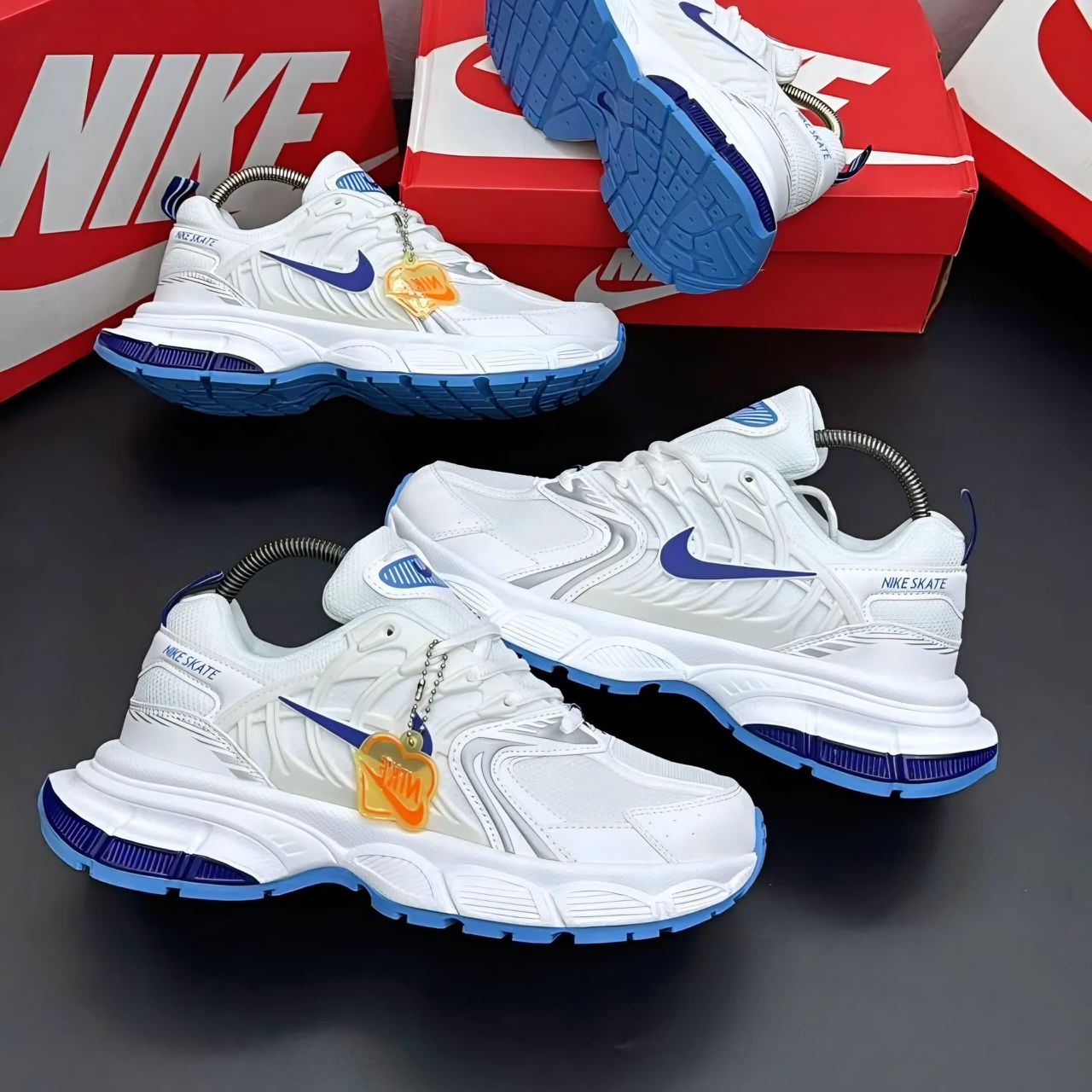 Hit the streets with a fresh, athletic look. These Nike sneakers combine the retro “dad shoe” aesthetic with modern technical details, featuring a breathable white mesh upper encased in a supportive cage design. Sharp Royal Blue accents on the Swoosh, tongue, and outsole add a vibrant pop of color to the clean white profile. Whether you are skating or just styling them for the city, these kicks deliver robust durability and standout style.