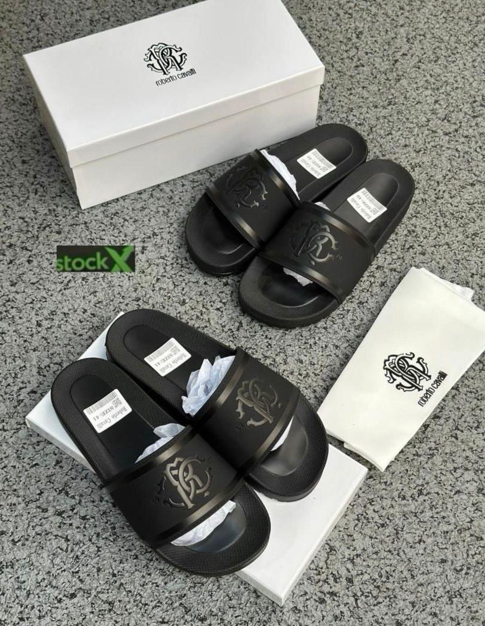 Step into sophistication with these premium Roberto Cavalli slides. A must-have for the modern gentleman, they feature a sleek matte black strap highlighted by the glossy, embossed “RC” monogram logo. The understated yet powerful design speaks to a refined taste, making them perfect for lounging at home or adding a touch of luxury to your beachwear.