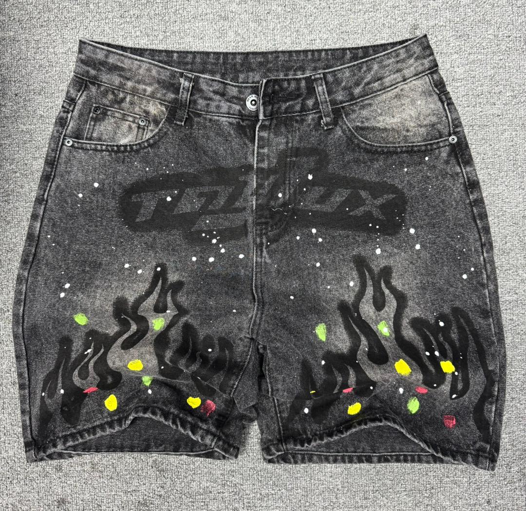 Ignite your fit with these high-energy denim shorts. Designed for the bold, these shorts feature a dark black acid-wash base that serves as the perfect canvas for the striking artwork. The hem is engulfed in stylized black flame graphics accented with neon green and yellow paint touches, while a massive graffiti-style logo dominates the upper front. Finished with artistic paint splatters throughout, this pair is a masterpiece of modern grunge streetwear.