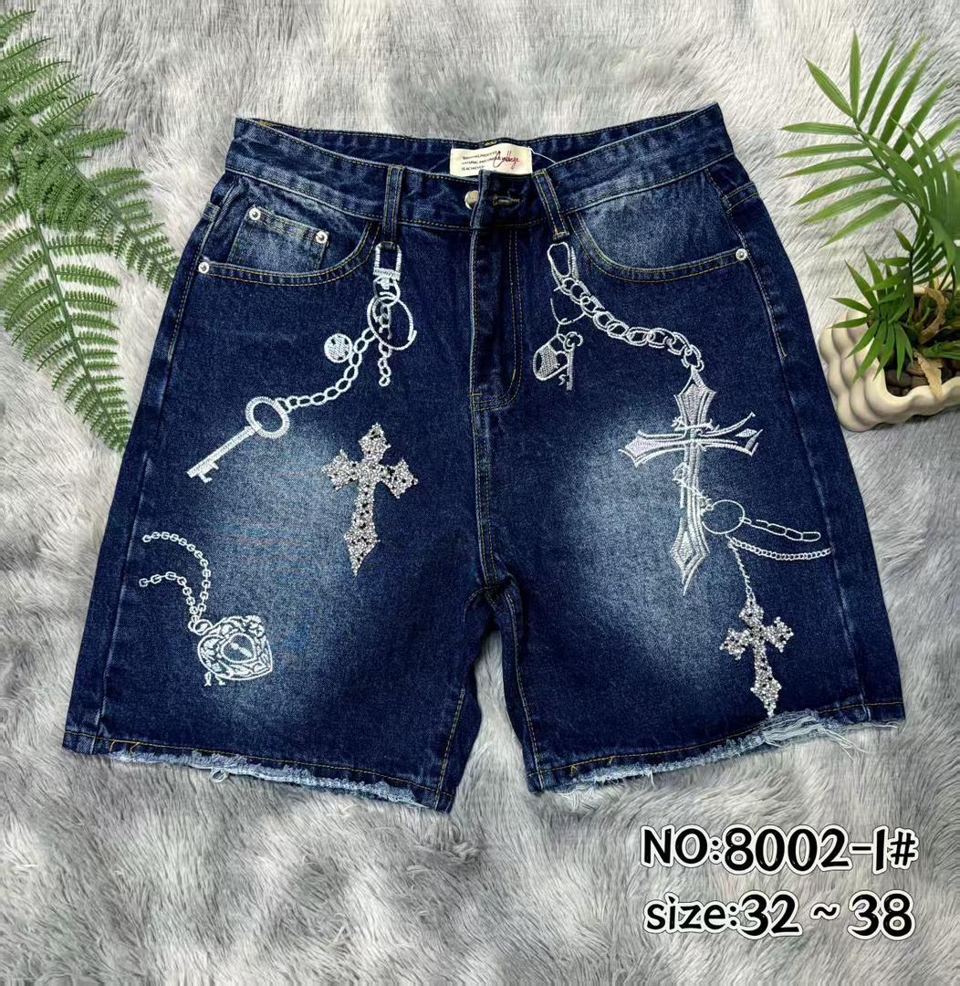 Level up your denim game with these intricately detailed streetwear shorts. Inspired by high-end gothic aesthetics, this pair features elaborate silver embroidery depicting heavy chains, keys, padlocks, and ornate crosses. Several of the cross motifs are embellished with rhinestone-style detailing, catching the light and adding a premium flash to your fit. Set against a deep indigo wash with subtle fading, these shorts are a true conversation piece.