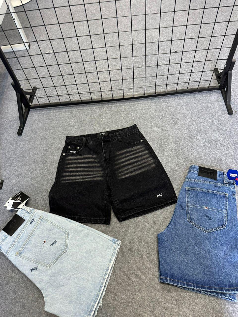 Refresh your summer lineup with these premium denim shorts, available in three distinct styles. Whether you want the rugged, rock-star look of heavy fading or the preppy-street vibe of all-over embroidery, this collection has you covered. The blue variations feature small, scattered flag logos embroidered throughout for a high-end designer touch, while the black pair focuses on bold, textural fading.