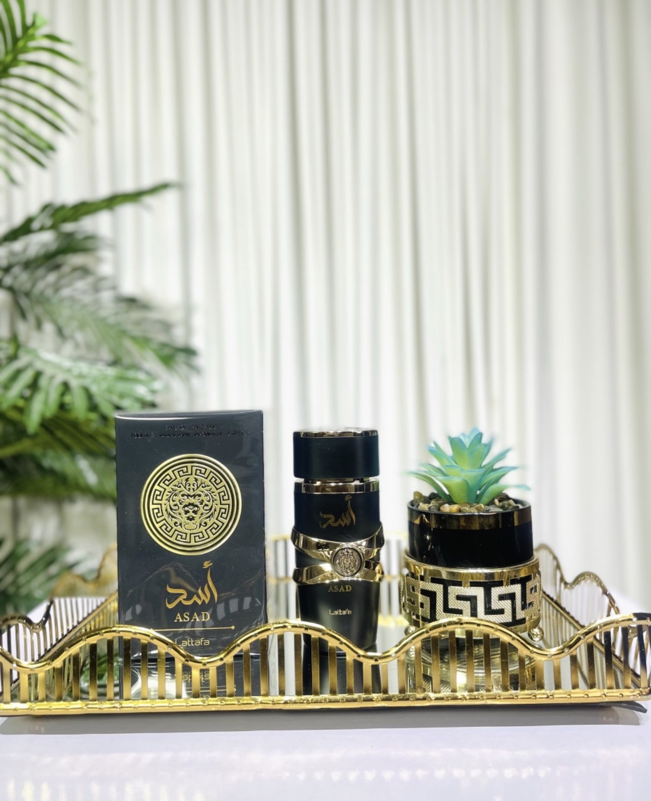 Yara is a sweet, powdery, and creamy oriental fragrance for women (notes of tropical fruits, orchid, vanilla), while Asad is a spicy, woody, and warm scent for men